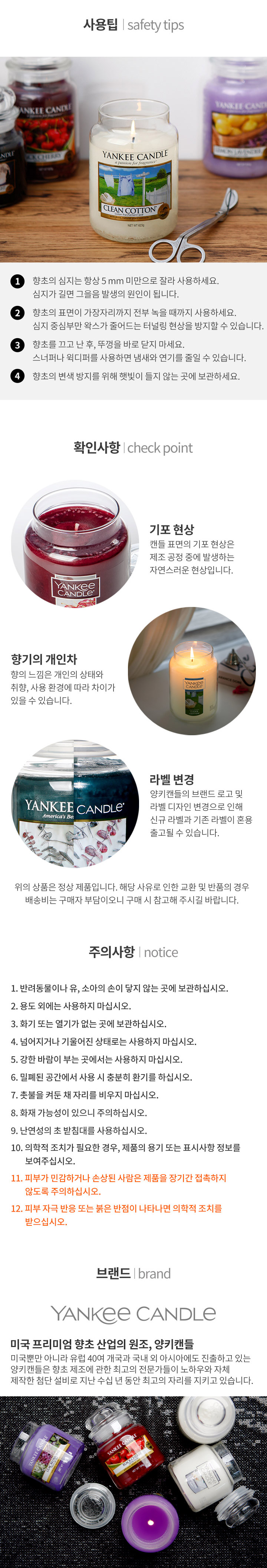• 상품의 교환, 반품, 보증 조건 및 품질보증기준은 '소비자기본법'에 따른 '소비자 분쟁 해결기준'에 따라 보상해 드립니다. 상품 하자로 인한 환불 또는 교환 등은 '공정거래위워회 소비자분쟁해결기준'에 의거하여 처리해 드립니다. 고객게시판이나 고객전화(캔들조이 02-2292-2581)로 요청하시면 빠른 시일내에 처리해 드리도록 하겠습니다.